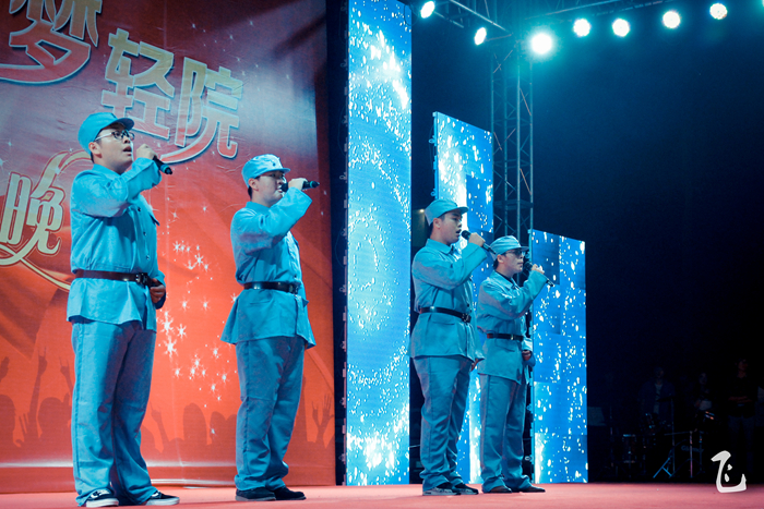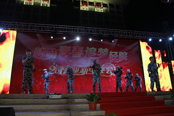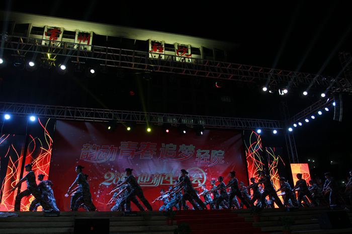 副院长毛伯民代表院党政领导作了热情洋溢的讲话,鼓励新同学秉承“自强不息,爱岗敬业”的邓建军精神,既要掌握精湛的专业技能,又要具备高尚的道德情操。激情的歌曲《自由》、《伤心的人别听慢歌》拉开了晚会的序幕。健美操表演充满青春活力;小合唱《游击队之歌》再现了革命乐观主义和大无畏精神;流行舞《企鹅哥哥》展示了轻院学子的热情奔放;歌曲联唱《薄荷与指甲剪》、《月半小夜曲》、《珊瑚海》、《become of you》体现了大学生朝气蓬勃的面貌和对美好未来的憧憬与期望;舞蹈《Good Boy》动感十足;女教官带来的英文歌曲《Telephone》别有韵味;舞蹈《在我生长的地方》与《相和歌》衣袂飘飘,充满民族风情,书法和茶艺表演展示了传统文化的魅力;音乐剧《黄河大合唱》让人在幽默恢谐中回味经典;新生的军体操表演让观众领略了刚柔相剂的军人风采;歌曲《逆战》仿佛把人们带到了硝烟弥漫的战场之中;舞蹈《Shady》时尚欢快。最后,在歌伴舞《美丽家园》的旋律中本次晚会划上圆满的句号。场内、场外互动频繁,教师、教官纷纷表演,老生、新生各展才艺,整场晚会洋溢着祥和、喜庆的气氛,歌声、笑声、掌声融成一片欢乐的海洋。