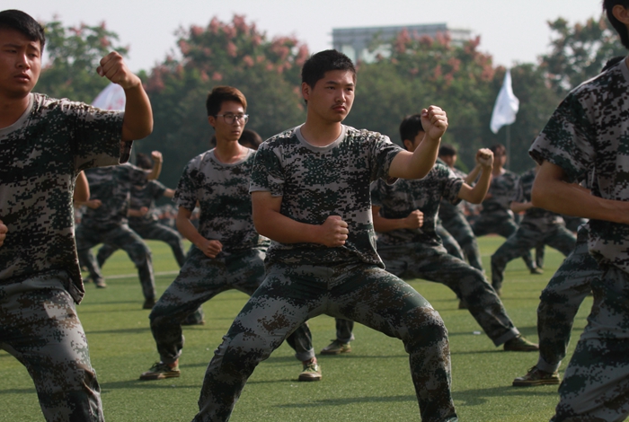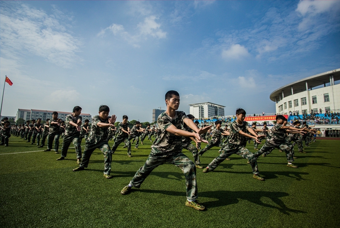 分列式表演完毕,各84人的方队,从足球场的两侧跑步进入场地中央,集合,散开,拉开了架势。随后,伴随着《精忠报国》动人的歌声,指挥教官喊道“军体拳表演,预备,开始!”,学员们便操练起来,一招一式,颇有章法,雄赳赳,气昂昂。标准、整齐划一的队列表演赢得满场阵阵掌声;38名学员展开了叠被子比赛,随后进行了紧急集合,3分钟内迅速完成着装、打背包及收拾行装集队完毕。战术模拟对抗演练分队摆好了数十个道具帐篷,场地两边各有10多名身着精锐装备的“特种部队”队员,他们手持“激光冲锋枪”,随时待命。随着领队一声令下,他们冲锋陷阵,枪声划破天空。历经一番鏖战,最后红方胜出。在红方占领敌巢的瞬间,本次军训汇报表演模块也就结束了。
