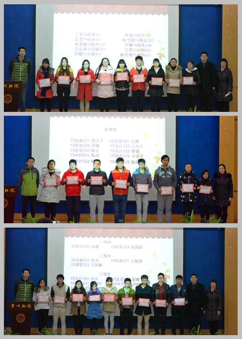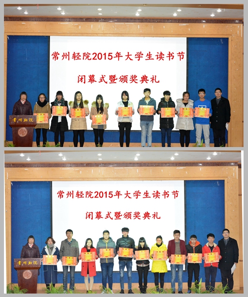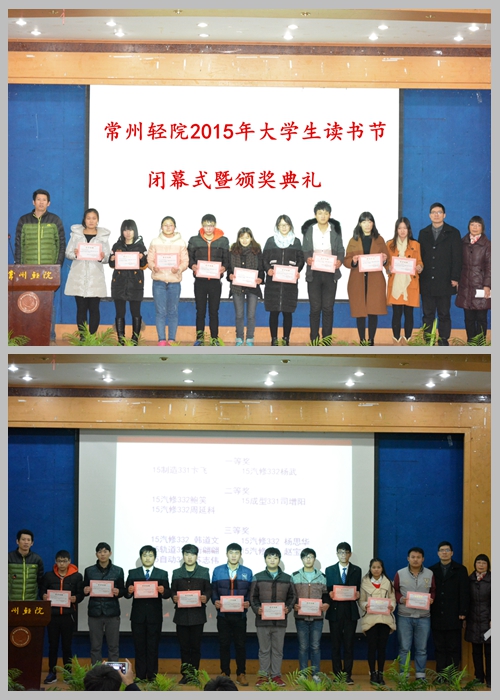 12月16日,在这阳光倾城的冬日,常州轻院2015年大学生读书节闭幕式在教学楼报告厅如期举行。院团委副书记季华、图书馆馆长马双琴、学工处处长柏铁山、图书馆的部分老师、全体获奖的八个系的学生代表,以及读者协会和创意与实践协会的同学们济济一堂,参加了隆重而又简短的闭幕式。