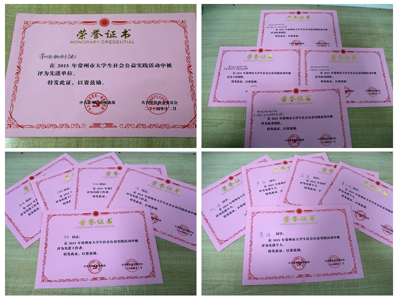 近日,常州市委统战部、共青团常州市委联合发文对2015年常州市大学生社会公益实践活动先进单位和先进个人进行表彰。我院荣获2015年常州市大学生社会公益实践活动先进单位;模具系“关爱特教学子,志愿美丽中国梦”社会公益实践团队荣获2015年常州市大学生社会公益实践活动十佳团队;机械工程系“为‘小橘灯’说法,还给留守儿童一片蓝天”社会公益实践团队、信息工程系“情系折翼小天使,共筑美丽中国梦”社会公益实践团队、经贸管理系“‘扶星助贫’公益系列活动”社会公益实践团队等3支团队荣获2015年常州市大学生社会公益实践活动优秀团队;季华、王骁俊、王平、徐克选、郭媛等5位老师荣获2015年常州市大学生社会公益实践活动先进工作者;刘洋、严丹、吴昊、鲁云凯、索浩等5位同学荣获2015年常州市大学生社会公益实践活动先进个人。