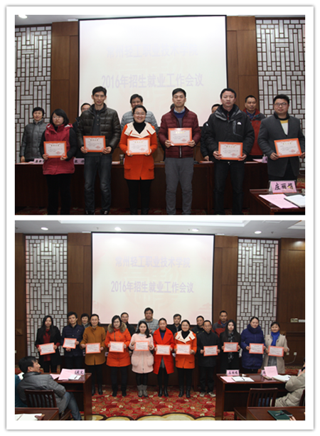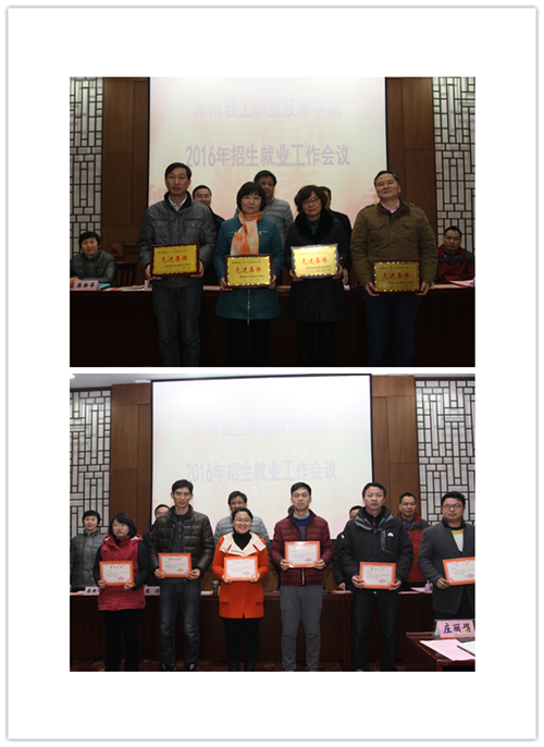 杨劲松院长宣读了《关于表彰2015年度招生工作先进集体和个人的决定》,授予电子电气工程系、机械工程系、经贸管理系、信息工程系四个系“2015年度招生工作先进集体”称号,授予陈蕾磊等17位教师“2015年度招生工作先进个人”称号。宣读了《关于表彰2015年就业工作先进集体和个人的决定》,授予机械工程系、信息工程系和经贸管理系三个系“2015年度毕业生就业工作先进集体”称号,授予陈蕾磊等14位教师“2015年度毕业生就业工作先进个人”称号。主席台领导为获奖的先进集体和个人颁发了奖牌和荣誉证书。