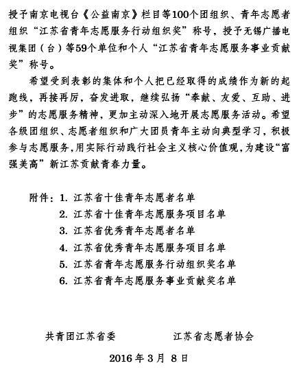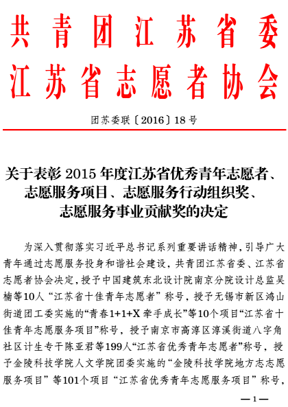近日,在共青团江苏省委、江苏省志愿者协会联合下发的团苏委联〔2016〕18号《关于表彰2015年度江苏省优秀青年志愿者、志愿服务项目、志愿服务行动组织奖、志愿服务事业贡献奖的决定》中,我院电子系团委喜获江苏省青年志愿者行动组织奖,常州仅六家团组织获此殊荣。