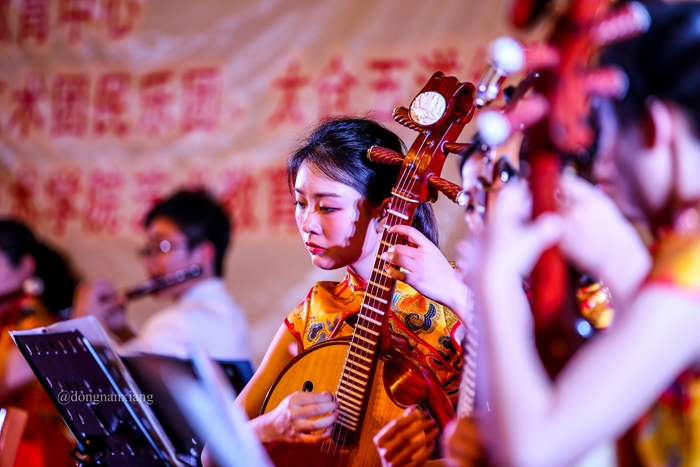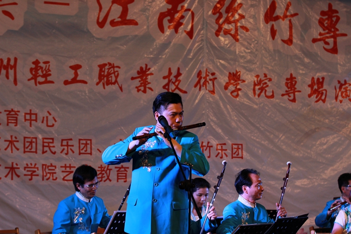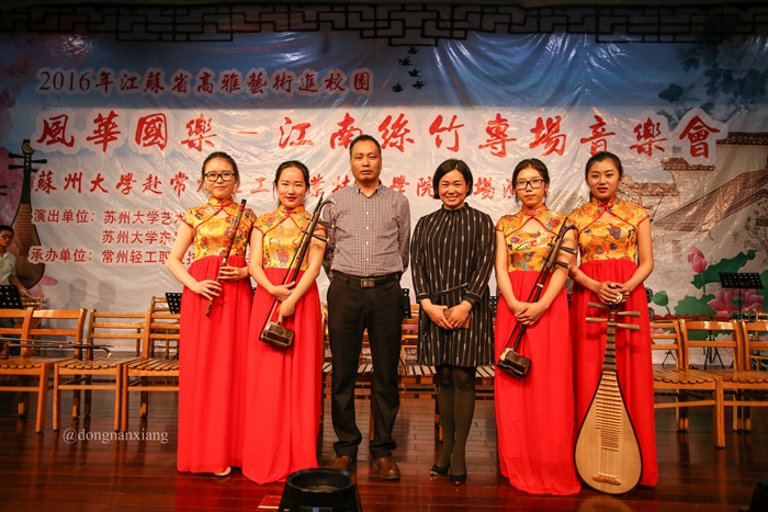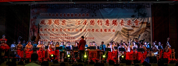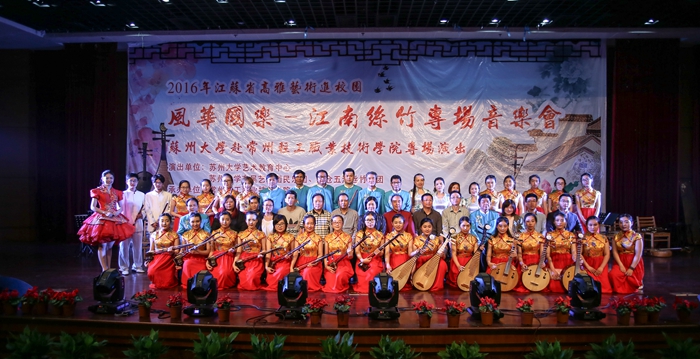 江南丝竹是中华民族民间音乐中一颗璀璨的明珠,距今已有数百年的历史,是我们宝贵的历史文化遗产。当晚的音乐会上,苏州大学东吴艺术团民乐团和太仓五洋丝竹乐团共同演奏的江南丝竹《三六》、《六花六节》,优美委婉的旋律使观众仿佛置身于江南水乡的美景之中;东吴艺术团民乐团带来的《苏堤漫步》、五洋丝竹乐团带来的《悦乐》,让大家领略到姑苏风情的韵味;笛子独奏《姑苏行》、二胡独奏《姑苏春晓》,演奏者高超的技巧和深情的演绎,博得观众热烈的掌声;民乐合奏《红星歌》,欢快的小军鼓节奏配合熟悉的歌曲旋律,带来完美的视听享受。