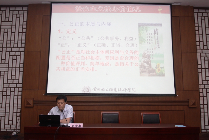 副院长蒋新萍宣读《关于成立社会主义核心价值观课程建设领导小组的通知》和《关于组建社会主义核心价值观课程组的通知》。思政部李立新老师为大家上了社会主义核心价值观《公正》课,李老师图文并茂、深入浅出地为大家讲解了公正的本质与内涵、公正是社会主义核心价值观的灵魂、实现社会公正的有效途径,翔实的案例、生动的语言,不仅让大家深刻透彻理解了“公正”的内涵,还让大家学到了利用热点话题来和学生互动的上课技巧。