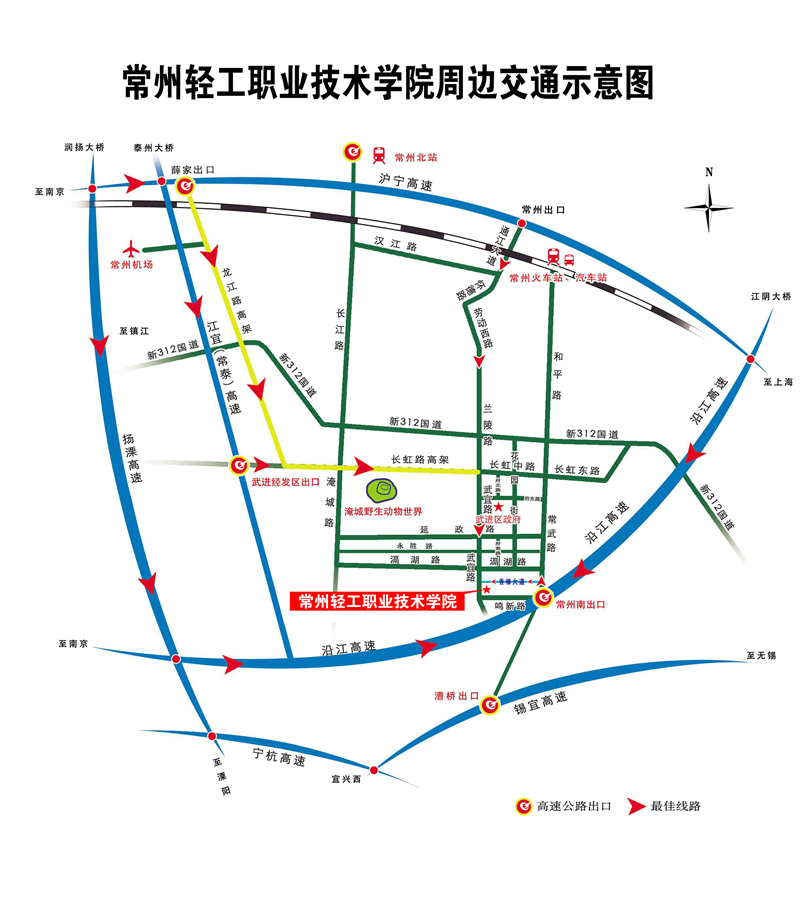 2.上海方向可由沪宁高速转沿江高速常州南(武进)出口下高速,朝常州市区方向开,进入科教城辅路,过第一个转盘向左行驶进入高职教育园区,一直向前行驶即可到达我校。