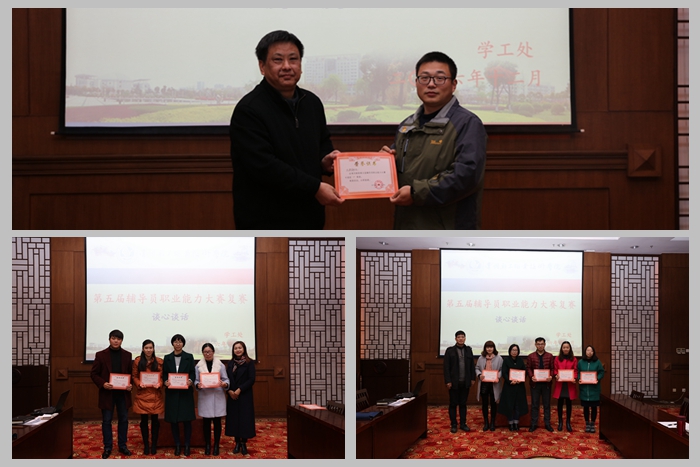 经过激烈角逐,评委根据参赛辅导员的综合表现现场打分,最终评定出一等奖一名,二等奖四名,三等奖五名。院党委书记杨兴华、招生处处长胡剑虹、学工处处长柏铁山分别为获奖选手颁发荣誉证书。