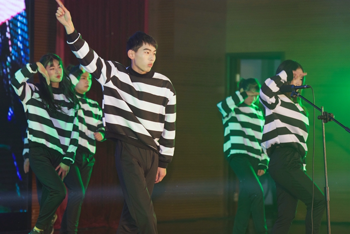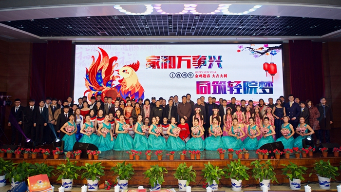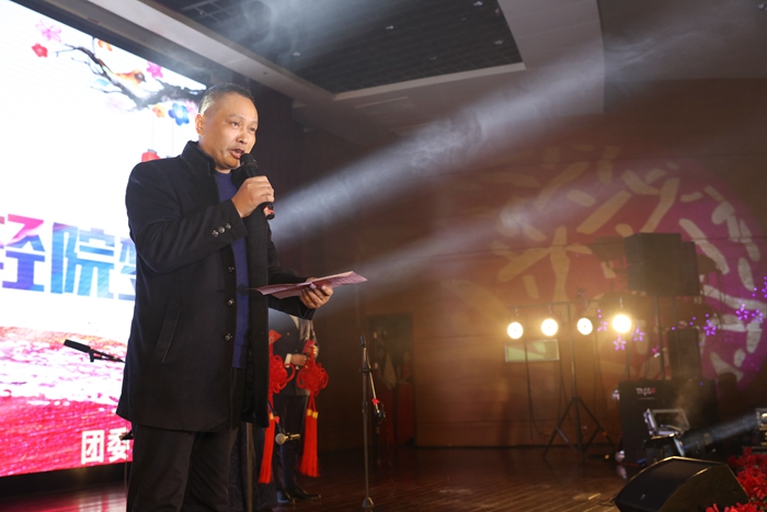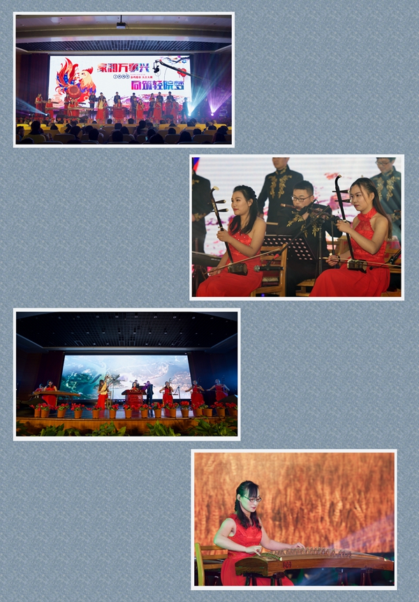 晚会首先由师生民乐演奏的《金蛇狂舞》拉开了晚会的序幕,毛伯民副院长致新年贺词,他满怀深情地回顾了我院在2016年取得的主要成绩,对全体师生致以新年的祝福,并祝愿晚会圆满成功。伴随着动感的节拍由only dance和JY dancer带来的爵士舞《Sugar》展现了轻盈的舞姿,舞动青春的旋律,把晚会的气氛调动了起来;我院“全国文明家庭”余美芳本人和家人也来到晚会现场,余美芳老师勉励我院师生要从自身做起,大力弘扬 “孝老爱亲、明礼友善”的传统文化,随后带来的小品《家的谎言》表达了儿子对父母的感激和感恩之情;合唱《鸿雁》期盼着每位学子能像鸿雁一样展翅翱翔;今年在江苏省音超联赛中我院获得唯一一支进入八强的高职院校的战队,轻院战队的队长徐凯满怀深情的带来一首《北京,北京》;接下来一支非洲鼓打击乐队来到舞台上,在视觉与听觉上都是一次震撼的表演;舞元素的帅哥靓女带来炫目的表演《keep on dancing》,让我们感受到激情和青春的活力;今天的晚会我们的老师也组织了一支不同年龄层的模特队,他们都是由我院各条战线的教职工组成,奉上了一台精彩纷呈的模特走秀,把晚会推向高潮;雨在花前落,花在雨中开,大学生艺术团用柔美的肢体语言为您讲述《雨中花》的情怀,因为有了雨,花显得娇俏多情;因为有了花,雨才有了生命律动;艺术系选送的歌伴舞《大梦想家》用最精彩的方式,绽放出我们最灿烂的花样年华;大学生艺术团给我们带来的小品《法网与智慧》讲述了在校园内的诈骗案件,告诉我们大学生的安全防范意识要加强;经管系的拉拉操队签约成为江苏女排的排球宝贝,她们的表演展现了我们轻院学子的青春活力;最后是杨滢老师带给我们的一首《祖国之恋》将晚会推向了另外一个高潮,以优美的旋律表达人民渴望国家富强的愿望,从内心涌出对国家的强烈的热爱,晚会最终在昂扬的旋律中完美落幕。