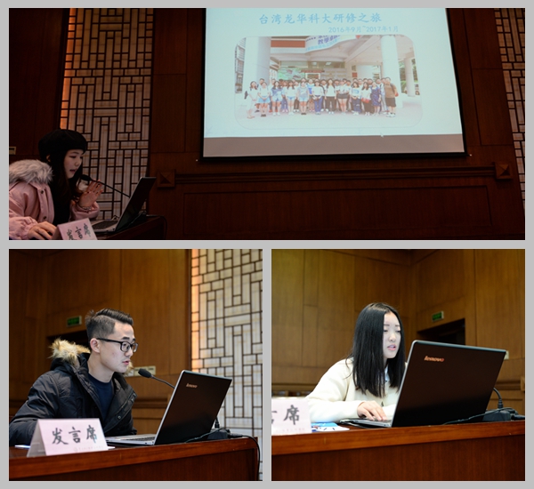 汇报会由王新芳、张素贞、章磊3名赴台研修教师和3名研修学生代表分别做了汇报。他们通过自己在台湾研修学习、生活的经历,分享了4个多月来在台湾龙华科技大学期间所见、所闻、所感及所悟。他们表示此次研修不仅提升了专业技能和素质,更加开拓了国际化视野,丰富了人生阅历。