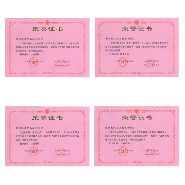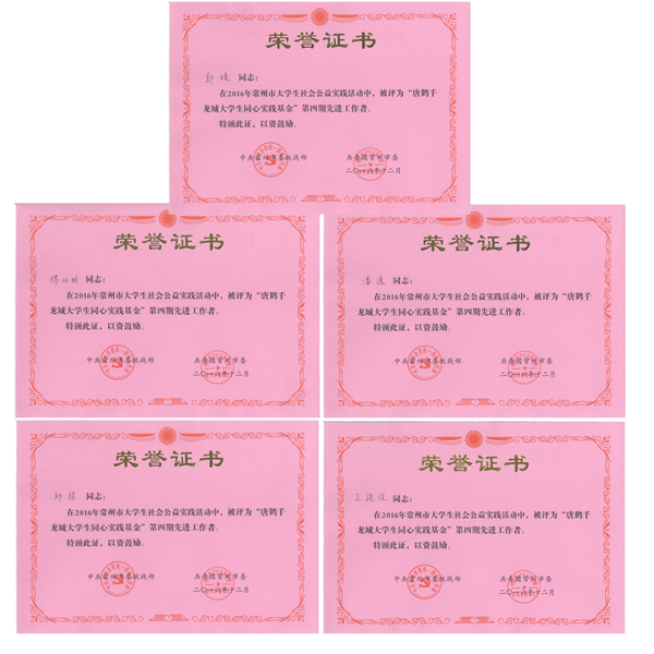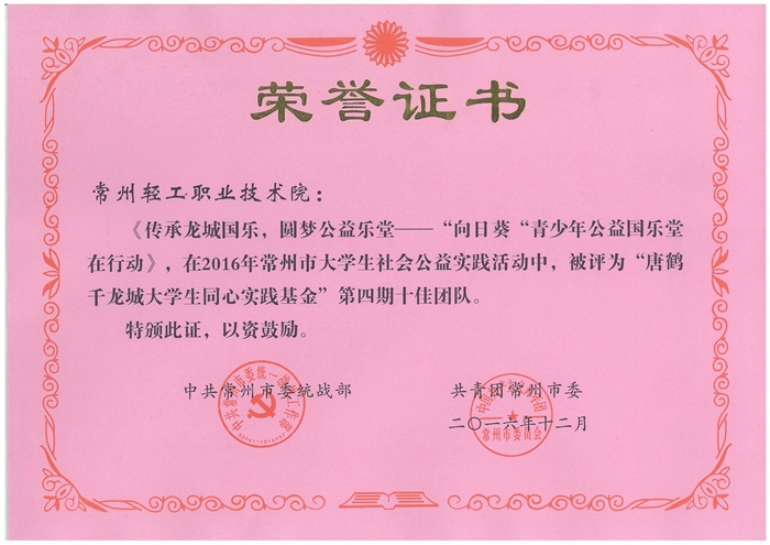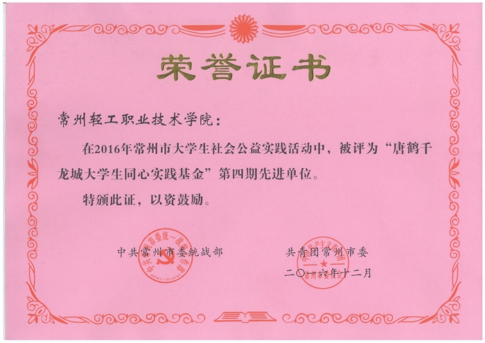近日,常州市委统战部、共青团常州市委联合发文对2016年常州市大学生社会公益实践活动先进单位和先进团队等进行表彰,我院荣获多项殊荣。学院荣获2016年“唐鹤千龙城大学生同心实践基金”先进单位;院团委《传承龙城国乐,圆梦公益乐堂——“向日葵”青少年公益国乐堂在行动》荣获“唐鹤千龙城大学生同心实践基金”十佳团队;艺术设计系《走近大山里的孩子—贵州普安县心田小学调研支教活动》、模具系《“团建同心、校地共建”大学生基层挂职项目》、轻工工程系《关爱马路天使,尊重“黄马甲》、信息工程系《走进邳州“希望之家”,陪护博爱之花》荣获优秀团队;潘逸、王骁俊、缪双明、邱程、郭媛荣获先进工作者;吴壮壮、徐晶晶、曹雨雷、陆虎、韦梦雪荣获先进个人。