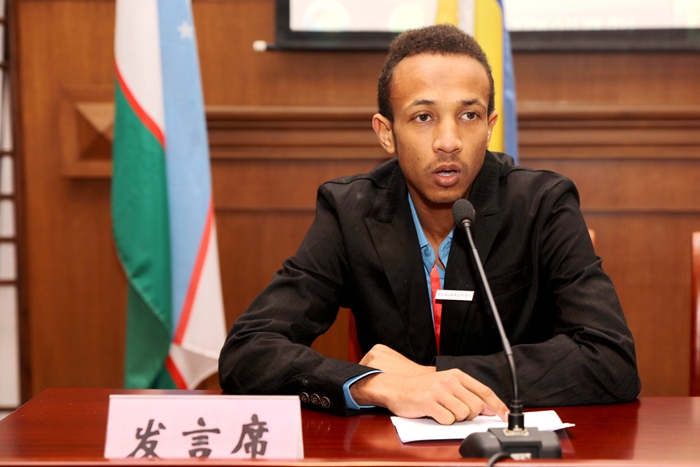 来自苏丹的顾平同学代表留学生发言。他说来到中国不仅要学好汉语,还要了解和学习中国文化,学会与不同国家的同学融洽相处,把轻院视为一个大家庭。