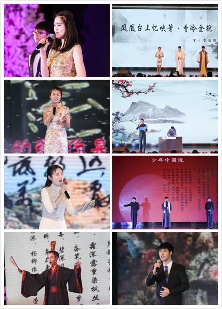 伴着悠悠乐声,主持人蔡经纬和顾晓燕以精炼优美的语言回顾了中华五千年诗歌的风采,一场精彩纷呈的诗词盛宴呈现于众人眼前。首先上场的旅游系刘思琪等三位同学带来了汪国真的《走向远方》,激励年轻人不畏风雨、奋发图强;紧接着轻工系董桢炜等人演绎了李清照的《凤凰台上忆吹箫•香冷金猊》,缠绵悱恻的诗句层层深入地表现了诗人的离愁别绪,余味无穷;艺术系深情款款道来林徽因的《你是人间四月天》,细腻而柔美;机械系一曲《精忠报国》让观众们感受到岳飞的豪情壮志,一首《满江红》道尽雄心;经管系武岳、李坪启、高伟将诗歌融入剧情,以毛泽东的《沁园春•长沙》带大家领略了一代伟人的宏伟抱负与浩然胸襟;模具系刘秀旺等人慷慨激昂地朗诵了梁启超的《少年中国说》,诗中朝气蓬勃的进取精神激起在场青年共鸣;随后电子系李磊一袭古装诵苏轼所作海棠诗,展现一代文豪的潇洒旷达,并以一首学生原创诗与原诗遥相呼应;信息系庄显辉带来的《七律•长征》激扬顿挫,气贯长虹,再次让大家感受到毛主席的豪迈气概。