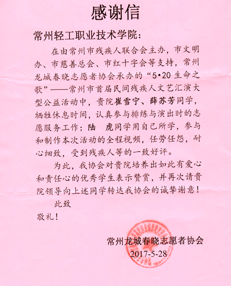 日前,艺术设计系团委收到了一封由学院办公室转发的感谢信,信件是由常州龙城春晓志愿者协会发出的,信中用朴实真挚的语言,表达了对学院领导老师以及艺术系青年志愿者的感谢。