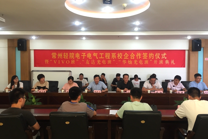 学院副院长姚庆文、校企合作部主任高振发、江苏百胜电子有限公司经理孙建、友达光电(昆山)有限公司经理林瑞烽、华灿光电(苏州)有限公司经理祝文君、电子系党总支副书记麻丽娟、系副主任沈治及校企合作班班主任出席了本次签约仪式。