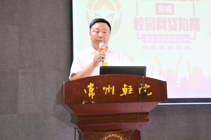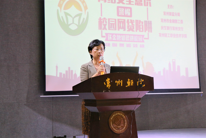 最后,金坛支行零售中心商士超经理,为与会学生带来了“增强网络安全意识、警惕校园网贷陷阱”专题讲座,商经理通过网络视频、新闻报道案例以及现场互动等丰富多彩的形式,充分展现了非法校园贷的危害,向学生们揭示校园金融风险的类型和危害,从而规避风险。
