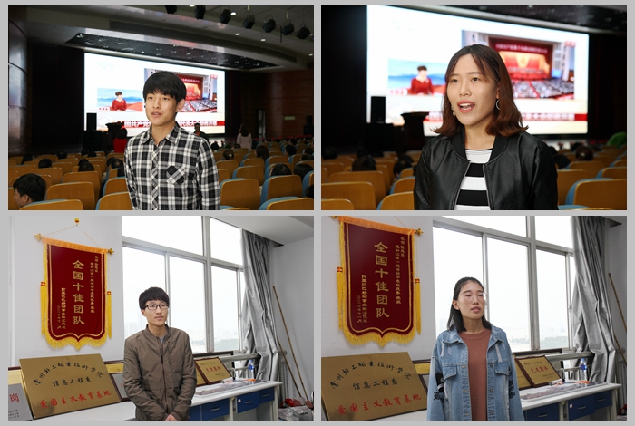 信息工程系15软件631班曹雨雷同学说:“作为一名大学生、一名中共预备党员,看到国家繁荣昌盛我很骄傲、自豪。十九大的召开对我们大学生来说,是一种鞭策,我们应该在自己力所能及的范围内做好每一件事情,努力学习,学好技能,做个对社会有用的人。”