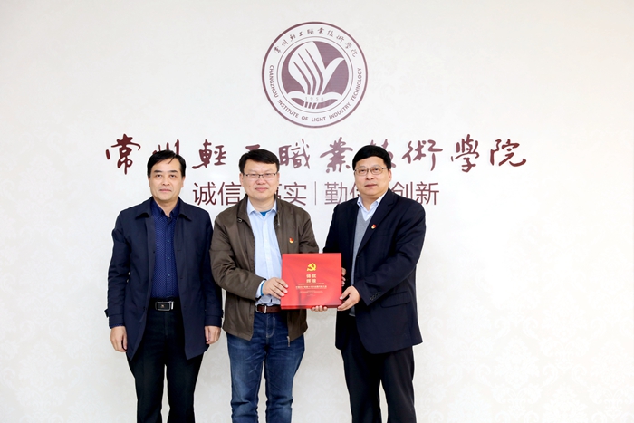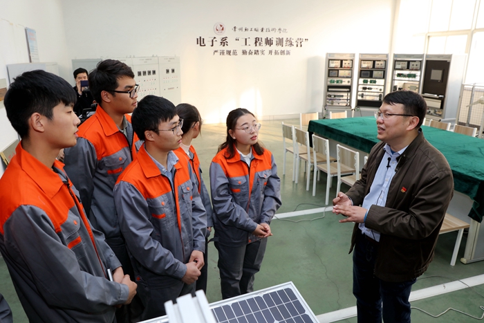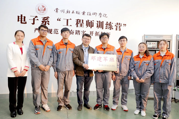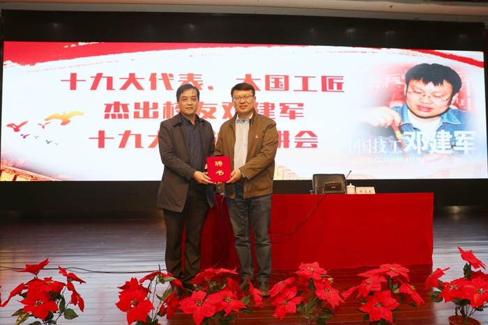 宣讲会之前,邓建军给母校赠送了从人民大会堂带来的纪念邮册,并接受了院长杨劲松颁发的产业教授聘书。会后,在杨劲松院长陪同下,邓建军来到他原来所在的电子系看望了正在参加2017年全国机械行业职业院校技能大赛的学生,与“邓建军班”的学生进行了交流,并参加了“邓建军班”班牌传承交接仪式。