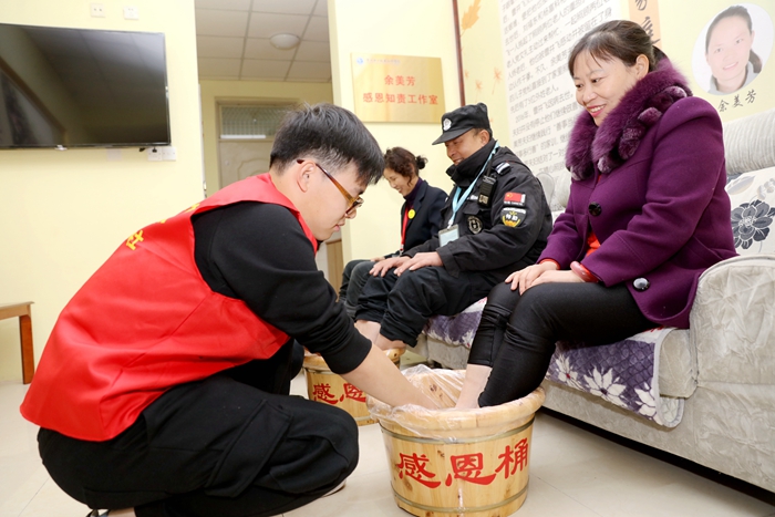 在院团委、学工处、保卫处的指导和支持下,11月 23日感恩节当天,模具系余美芳感恩知责工作室的同学们组织开展了一场特别的暖心感恩活动——温暖从脚开始。他们分别邀请自己的母亲、学校的保安大叔和公寓宿管阿姨来到工作室,让他们享受了一把足疗的惬意。其中一位同学的母亲脸上一直洋溢着感动的微笑,她深有感触的说:“以前每逢天气变凉时,我在家也是天天泡脚的,但从来没有想过自己的儿子能亲自给我足疗,这一份孝心让我感动不已。感谢学校给我这次体会感恩的机会,更感谢余老师的言传身教,孩子在轻院读书,我们家长很放心”
