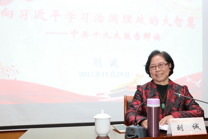 刘诚教授在报告中将十九大与七大、十二大进行类比,称其为中共党史的第三座里程碑,凸显了十九大的重要历史地位,进而高屋建瓴,引经据典,从五个方面详述了习近平治国理政的大智慧,她认为:十九大报告对国情发展阶段的准确判断,是治国理政的第一要义;十九大报告是对过往五年的谋篇布局和对今后发展高屋建瓴的顶层设计;十九大报告体现了党的指导思想与时俱进;十九大报告是战略指引,体现了中国共产党治国理政的基本方略和主要任务;十九大报告指出,党的领导是实现中国梦的根本保证,全面从严治党永远在路上。