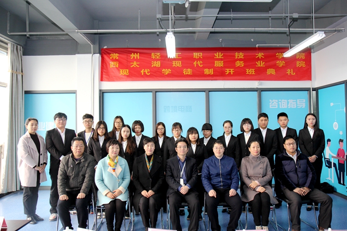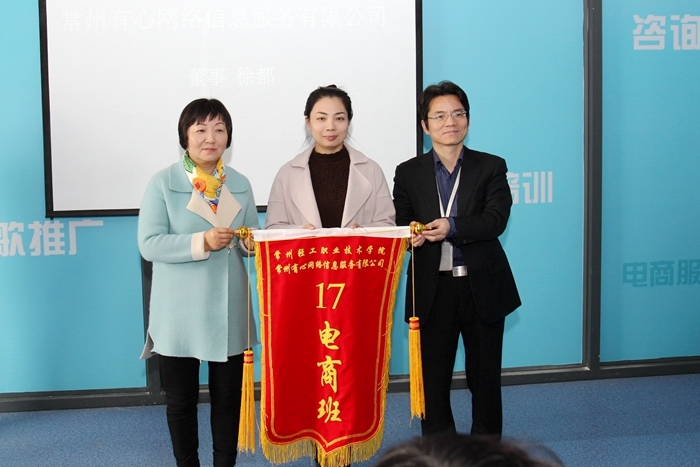开班典礼上,有心网络信息服务有限公司董事徐都介绍了班级的情况,经过企业前期的校园宣讲,学生去企业实地参观,校企双方多次沟通协调,“有心”电商现代学徒制试点班正式成立。该班采用“现代学徒制”式授课方式,学生主要选自学院经贸管理系国际贸易实务、国际商务、商务英语专业,前期课程在校学习,专业课、实训实践课程则进入企业学习。学生代表许洁表示,将好好珍惜这个学习锻炼的机会,踏实进取,不负众望,早日成为现代企业所需的专门性人才。蒋新萍对西太湖科技产业园管委会的大力支持、有心网络公司的积极推进和我院师生的通力配合表示感谢;要求切实办好“有心”班,并以“有心”为起点,推进现代服务业学院的持续建设;希望“有心”班的同学们能珍惜这次宝贵的学习机会;希望相关指导老师们在用心做好学生管理和指导工作的同时,能积极参与企业的生产实践,提高教学水平和科研能力;希望各位“师傅们”在完成繁重的本职工作的同时,因材施教、宽严并济,教徒弟们真本领,教徒弟们会做人。学院宣读了班级学员名单,并为试点班授班旗。