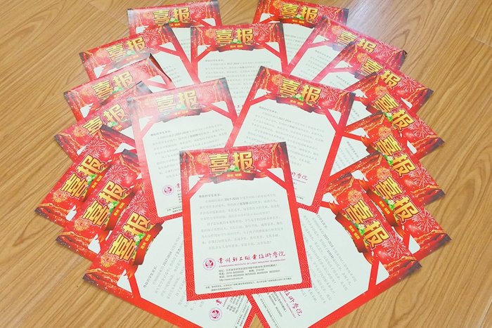 本次“喜报”的寄送范围包括2017-2018年度国家励志奖学金、新生奖学金、2017年全国职业院校技能大赛、2017江苏省高等职业院校技能大赛、2017“挑战杯”全国竞赛江苏省选拔赛、全国大学生数学建模竞赛以及“天翼杯”江苏省第六届信息安全技能竞赛的获奖学生。
