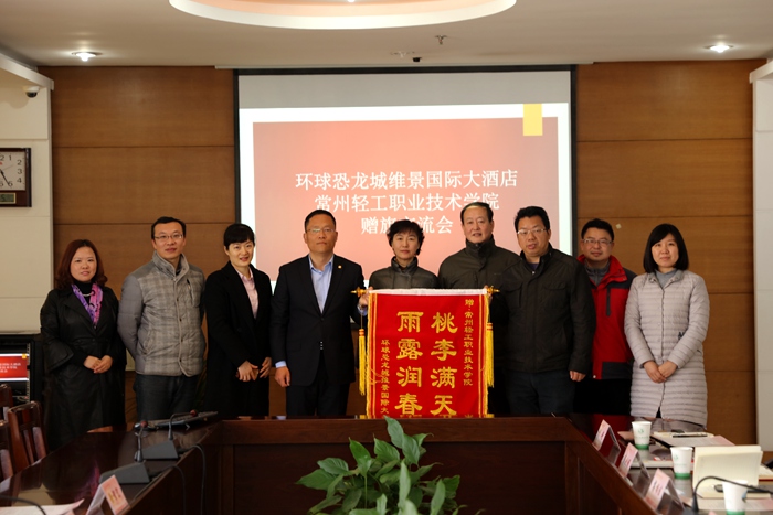 3月6日,环球恐龙城维景国际大酒店总经理赵钢、人力资源总监陈秋萍一行来我院赠送锦旗,赞扬我院“桃李满天下,雨露润春华”。校企合作处处长褚守云代表学院接收锦旗。学院副院长蒋新萍、旅游与烹饪学院党总支书记高振发出席赠旗仪式。仪式由旅游与烹饪学院副院长邢凯岭主持。