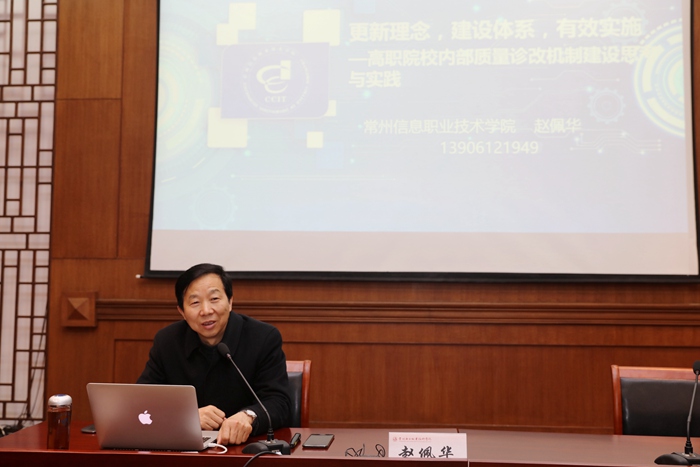 赵佩华以《更新理念、建设体系、有效实施——高职院校内部质量诊改机制思考与实践》为题,全面解析了什么是诊改、为什么要诊改、诊改哪些内容、怎样建设体系、如何实施诊改、诊改实施体会等内容。首先从内部质量保证体系诊断与改进工作的背景、依据、目标、任务、重点与发力点等方面,总体介绍了全国高等职业院校内部质量保证体系诊断与改进工作进展情况。然后,对内部质量保证体系诊断与改进如何建设与运行进行了详细解读,重点阐述了如何从学校、专业、课程、教师、学生五个层面进行设计与运行,以促进学校内部治理形态、教学形态、组织形态和办学形态的转变,助力学校内涵发展。最后结合常州信息职业技术学院内部质量保证体系建立和运行实践经验,共享了几点工作体会。