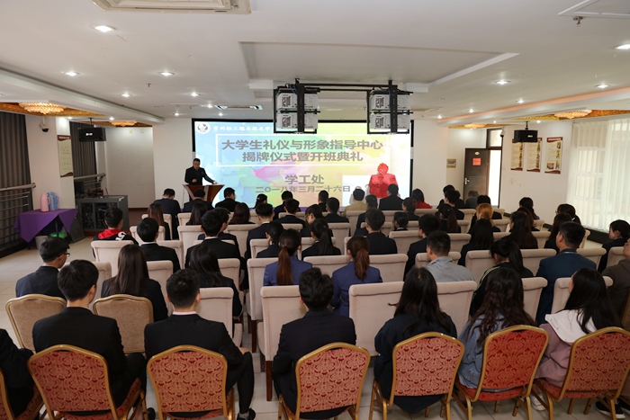 为进一步深入贯彻《高校思想政治工作质量提升工程实施纲要》精神,推进学院“八大工程”之“学生素质提升工程”建设,强化学生文明礼仪教育,实现课程育人、实践育人、文化育人和服务育人功能,3月26日下午,学院“大学生礼仪与形象指导中心”正式揭牌。院党委副书记毛伯民、宣传部部长张燏、旅游与烹饪学院党总支书记高振发、学工处处长柏铁山、学院团委副书记嵇天培以及各二级学院副书记、分团委书记、培训学员一起参加揭牌仪式暨开班典礼。