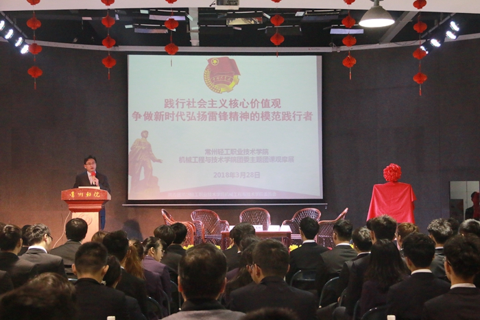 为切实增强基层团组织的凝聚力和创新力,引导广大团员青年自觉践行社会主义核心价值观,弘扬雷锋精神,3月28日下午,机械工程与技术学院分团委召开了“践行社会主义核心价值观,争做新时代弘扬雷锋精神的模范践行者”主题团课观摩展。主题团课参加对象为机械学院团委学生会团学干部、2017年挂职大学生村官、在校各班班长团支书。常州市中心血站献血服务科主任孙华英、天宁区雕庄街道朝阳村党总支书记姚志帼观摩了此次团课,团课由机械学院分团委书记王平主持。