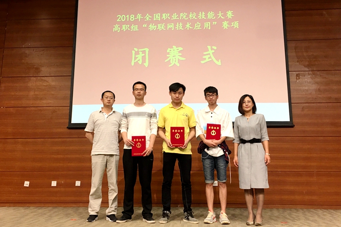 5月8日,2018年全国职业院校技能大赛高职组“物联网技术应用”赛项在天津中德应用技术大学举行,来自全国近30个省区的102支代表队同场竞技,竞争异常激烈。最终由信息工程与技术学院教师袁凯烽、何涛指导,黄焕林、王昆、刘立铭3位同学组成的代表队密切配合,不畏强手、发挥出色,以优异成绩荣获二等奖,为学校再添一枚奖牌。