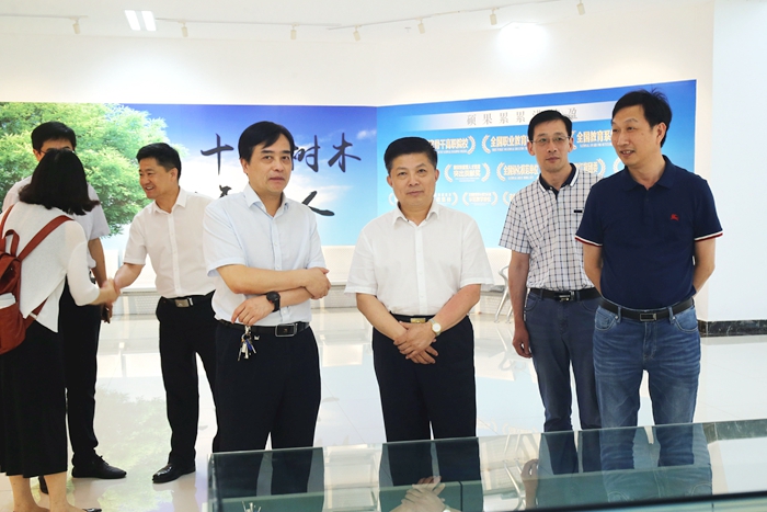 在滨州职业学院,党委书记杨光军及相关部门负责人陪同杨劲松一行参观了该校60周年校庆校史陈列室、专业综合实训场所、政企军校合作共建的移动云教学大数据研究中心以及瑞鑫地毯等企业研究院所,双方就内部质量保证体系诊断与改进、学校专业文化建设、校企合作、产教融合、专业建设、课程建设等共同关心的问题进行了深入座谈。
