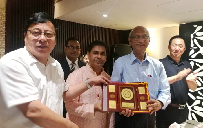 与孟加拉国国务部部长、教育部部长和中国驻孟大使合影