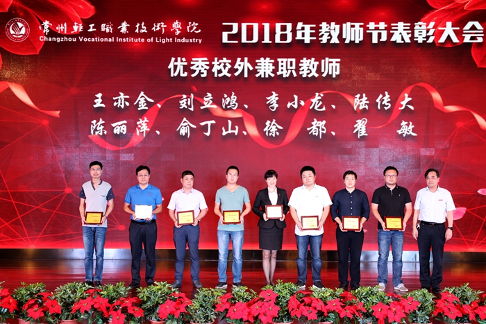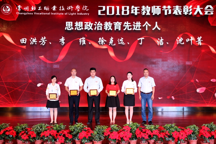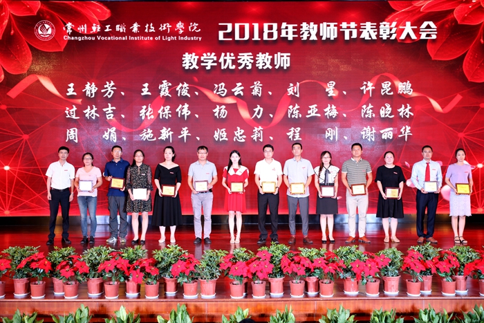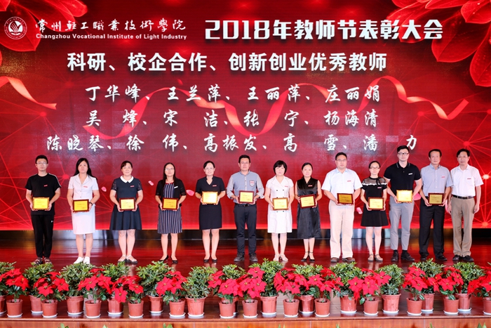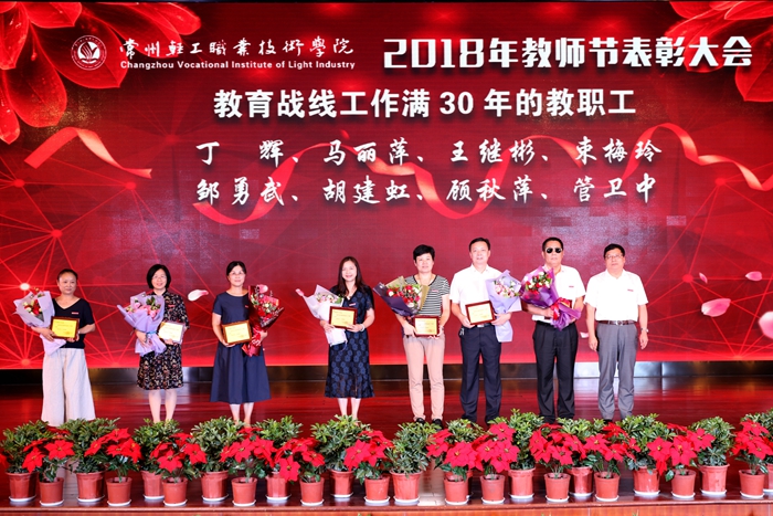 表彰会上,杨劲松宣读了《2018年教师节表彰先进个人的决定》。缪昌武为丁辉等8位教育战线工作满30年的教职工颁奖并送上鲜花;杨劲松为王亦金等8位优秀校外兼职教师颁奖;毛伯民为田洪芳等5位思想政治教育先进个人颁奖;壮国桢为陈浩华等9位优秀教育工作者颁奖;蒋新萍、姚庆文、吴丽云分别为在技能大赛作出突出贡献和在教学、科研、校企合作、创新创业等方面取得优异成绩的42位优秀教师颁奖。
