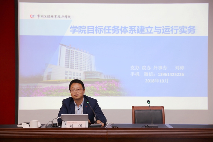 10月26日下午,我院诊改高级实务研修班举行“党政工作任务分解实务”专题报告会。邀请了常州工程职业技术学院党办、院办、外事办主任刘涛作题为《学院目标任务体系建立与运行实务》的专题报告。学院领导杨劲松、毛伯民、蒋新萍、姚庆文、吴丽云,全体中层干部及科级干部参加了报告会。报告会由质量监督与控制处处长张金兴主持。