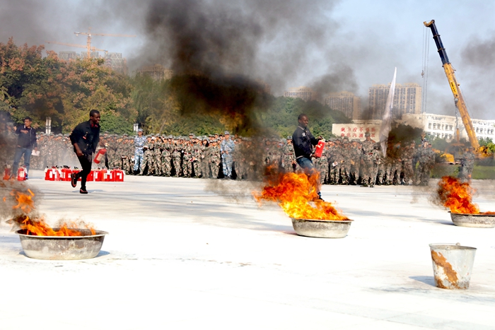 此次消防演练分两个环节进行。在紧急疏散环节,警报鸣响,烟雾弹立即燃放,同学们按照事先设定的疏散路线,采取掩口鼻、弯腰姿势前进,从宿舍楼快速有序地撤离到图文楼北广场。各连队教官迅速清点人数,报告相关负责人,整个疏散过程井然有序。随后是初起火灾扑救环节,采用竞赛形式。在学习了灭火器的正确使用方法后,来自8个二级学院及海外教育学院的学生选手分为九组参赛,以灭火时间长短确定最终名次。