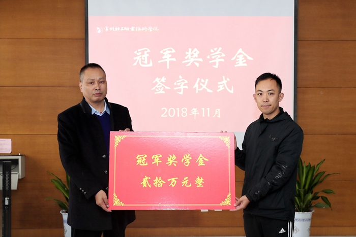 11月26日上午,我校2008级校友姜冠军捐赠20万元人民币设立“冠军奖学金”,用于奖励学习成绩优秀的学生,为母校建校60周年献上了一份厚礼。学院举行“冠军奖学金”签约仪式。学院党委副书记毛伯民、校友姜冠军出席仪式并讲话。