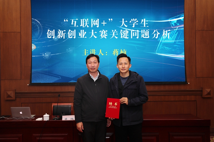 11月28日下午,我院邀请全国高校创新创业投资服务联盟副秘书长、中国“互联网+”大学生创新创业大赛总冠军项目创业导师蒋楠为我院老师进行了题为《“互联网+”大学生创新创业大赛关键问题解析》的讲座,并聘请他为我院创新创业导师,学院副院长姚庆文为其颁发聘书。