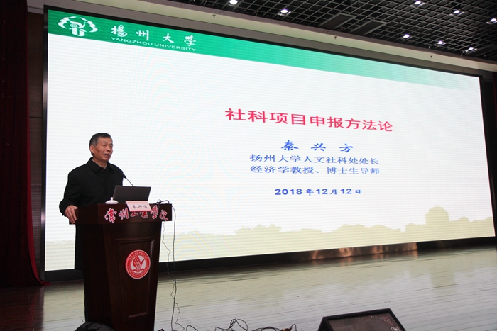 12月12日,扬州大学人文社科处处长、经济学教授、博士生导师秦兴方应邀为我校作“社科项目申报方法论”学术报告。学校党委书记缪昌武、各二级学院院长、全体教师参加了会议,学校副院长蒋新萍主持讲座。