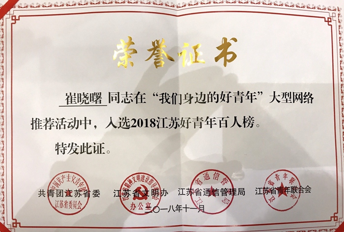 由团省委、省文明办等单位评选的2018江苏好青年百人榜揭晓,我校崔晓曙老师入选2018江苏好青年百人榜。