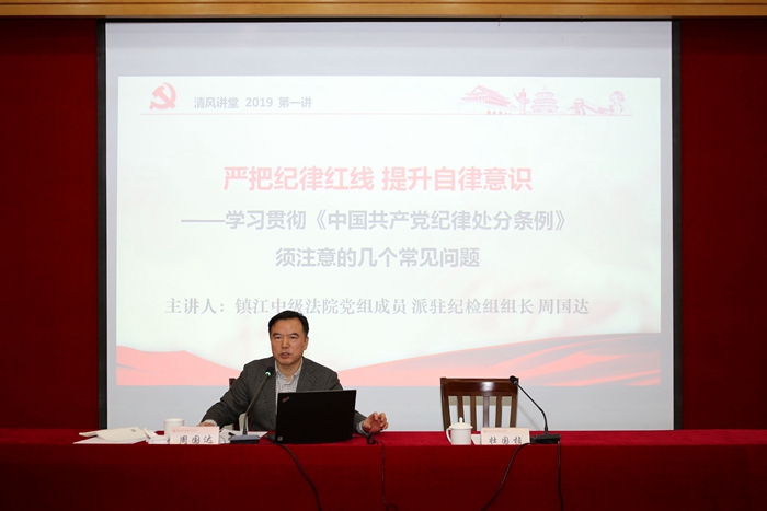 为进一步加强学校党风廉政建设和反腐败工作,不断提高党员领导干部廉洁自律意识,3月15日,学校邀请镇江中级人民法院党组成员、派驻纪检组组长周国达来校作“严把纪律红线、提升自律意识”的专题讲座。会议由纪委书记壮国桢主持。