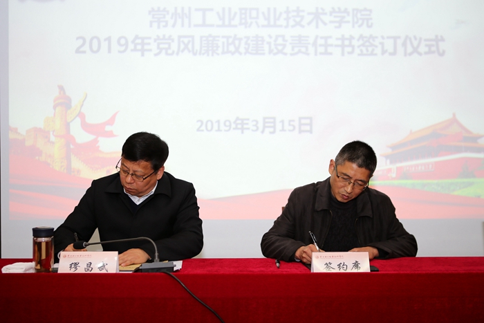 讲座结束后,学校举行了2019年党风廉政建设责任书签约仪式。党委书记缪昌武代表党委与各党总支党政负责人、各部门负责人签订了《2019年党风廉政建设责任书》,进一步明确了党风廉政建设的责任主体、责任范围、责任内容,确保各项责任落到实处。