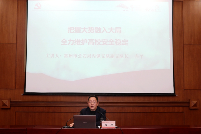 常州市公安局内保支队副支队长左平作了主题为《把握大势融入大局,全力维护高校安全稳定》的报告。他从当前高校政治稳定安全工作的风险点、形势和短板、有效开展工作的建议三方面对高校政治稳定安全工作尤其是意识形态领域安全工作进行了分析研判,为我校2019年意识形态工作提供了具体思路。