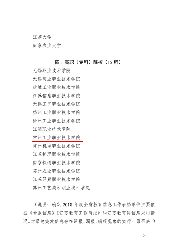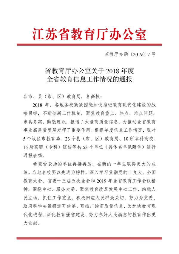 近日,江苏省教育厅下发了《关于2018年度全省教育信息工作情况的通报》,我校获2018年度全省教育信息报送工作表扬单位。据悉,此次全省共通报表彰了包括区市县教育局、本科院校、高职院校等在内的53个单位,其中高职(专科)院校15所,在常高校仅两所高职院校上榜,我校位列其中。这是我校继2017年以来,教育信息报送工作再次获省教育厅表彰。