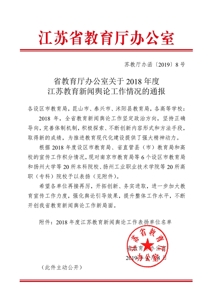 近日,江苏省教育厅下发了《关于2018年度江苏省教育新闻舆论工作情况的通报》,我校获2018年度江苏省教育新闻舆论工作表扬单位。这是我校继2017年以来,教育新闻舆论工作再次获省教育厅表彰。