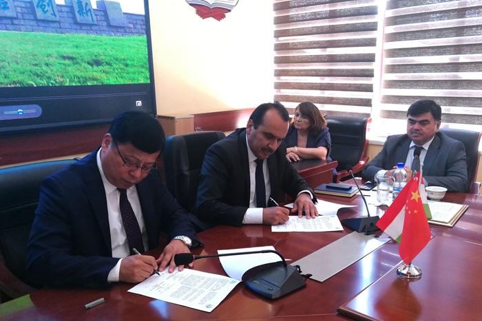 在塔吉克斯坦科技大学,缪昌武与阿蒙佐达・伊尔霍姆・特穆尔代表双方签署了校际合作框架协议书,并为阿蒙佐达・伊尔霍姆・特穆尔佩戴了我校校徽。