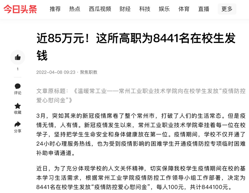 今日头条-近85万元!这所高职为8441名在校生发钱