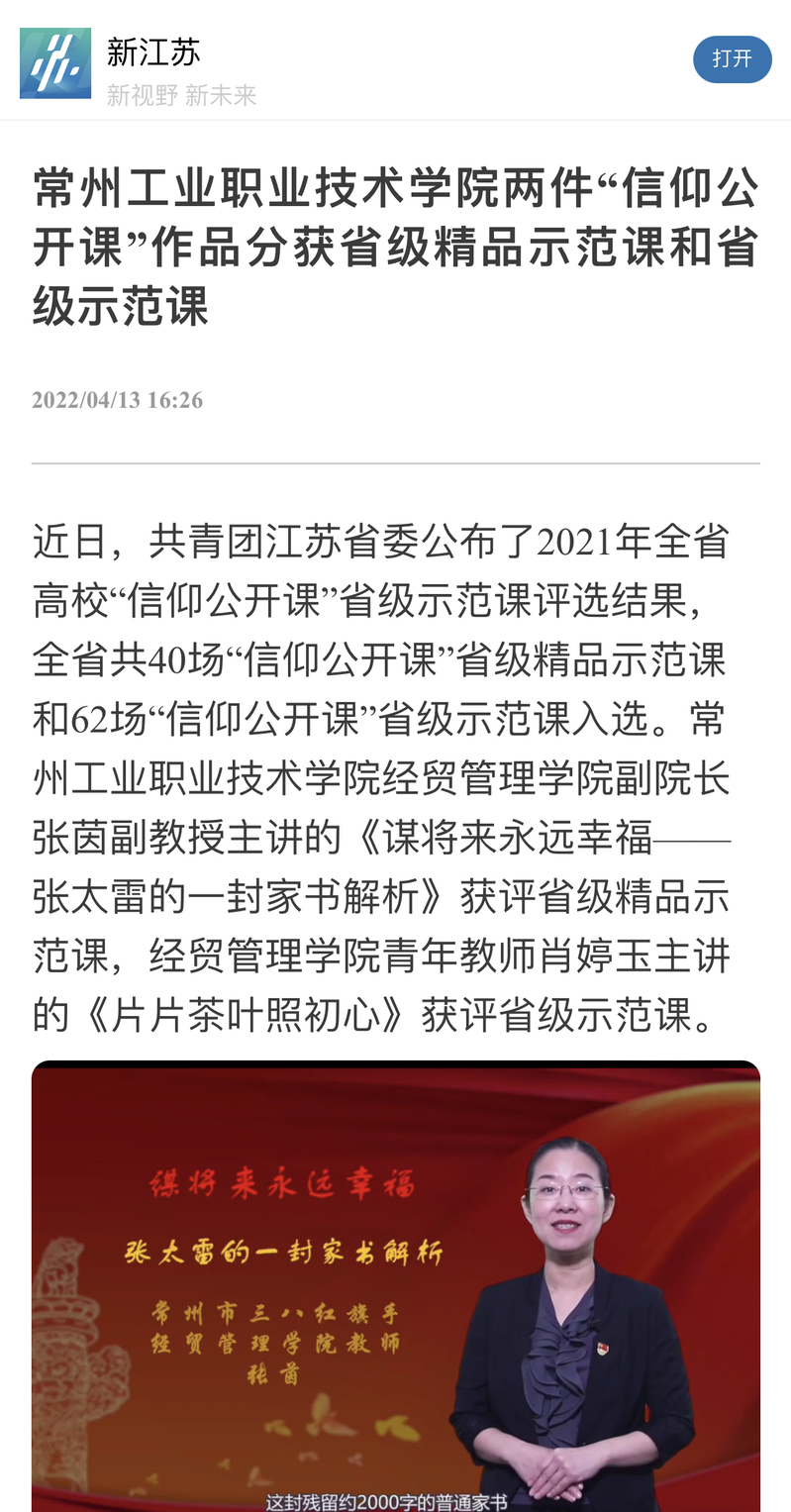 新江苏-常州工业职业技术学院两件“信仰公开课”作品分获省级精品示范课和省级示范课