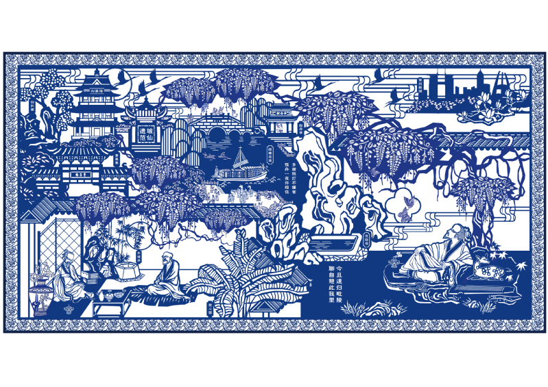 该作品在苏东坡诞辰988周年与常州第十五届东坡国际文化节之际应运而生,成为以非遗艺术诠释廉洁文化的生动典范。作品匠心独运,巧妙引用苏轼名句,并融合金坛刻纸细腻镂空的技艺精髓。画面中,“紫藤清影”与“竹影清风”等意象交织“顾塘迎坡”“坡仙遗范”等历史典故,生动再现了苏轼于贬谪逆境中仍心系民生、廉洁自守的旷达襟怀。方寸之间,纸薄意深,创作者以层叠刀法精准刻画出苏轼衣衫简朴而神情坚定的形象,深刻揭示出“此心安处”并非退隐独善,而是植根于“为民请命”廉政实践的崇高境界。尤为巧妙的是,作品以苏轼亲手种植的紫藤为视觉纽带,将历史的舣舟亭、青果巷与现代化的常州城市剪影串联一体,辅以常州市花月季为饰,象征清廉美德跨越古今、生生不息的精神传承。