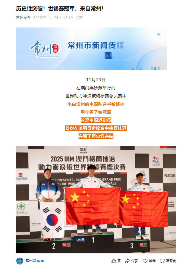 常州发布:历史性突破!世锦赛冠军,来自常州!