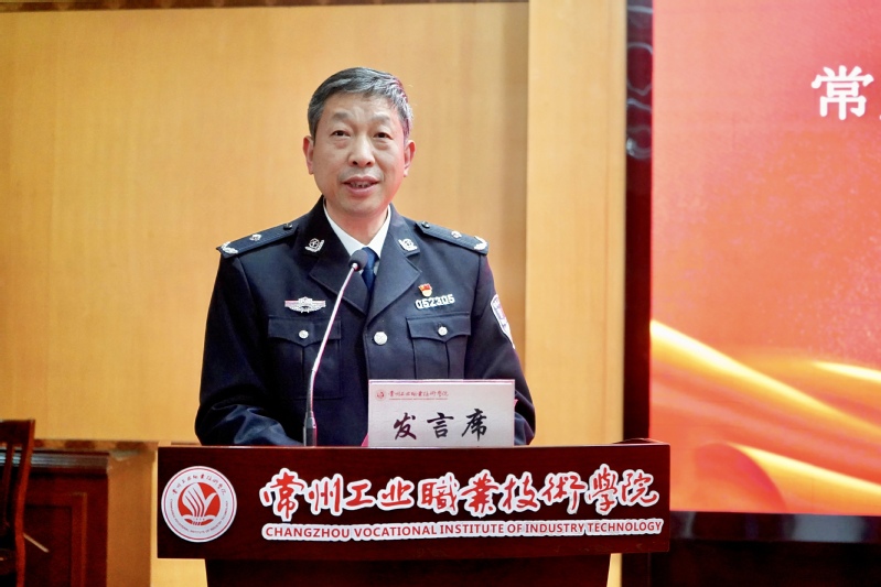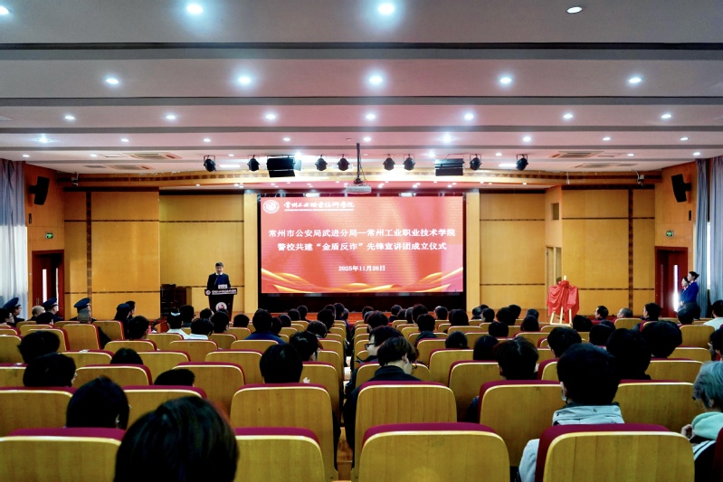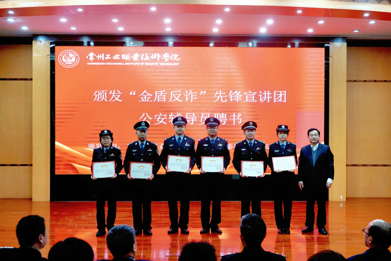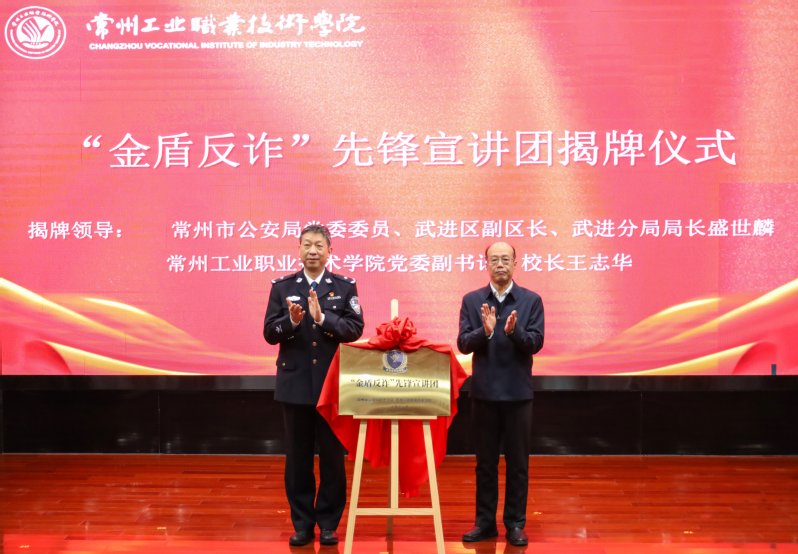 11月26日,常州市公安局武进分局—常州工业职业技术学院警校共建“金盾反诈”先锋宣讲团在我校成立。常州市公安局党委委员、武进区副区长、武进公安分局局长盛世麟,常州市公共交通和单位内部安全保卫公安局局长于云寅,武进公安分局副局长张志伟,我校党委书记席海涛、校长王志华、副校长檀祝平出席成立仪式。仪式由党委副书记吴丽云主持。