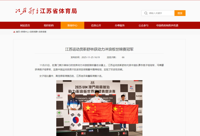 江苏省体育局:江苏运动员靳舒林获动力冲浪板世锦赛冠军